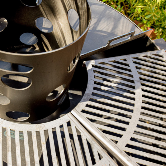 Barbacoa. Parrilla Semicircular + Asador Libro. Fogonero Sambo 1 metro. Paellero de Jardin. Diseño Moderno