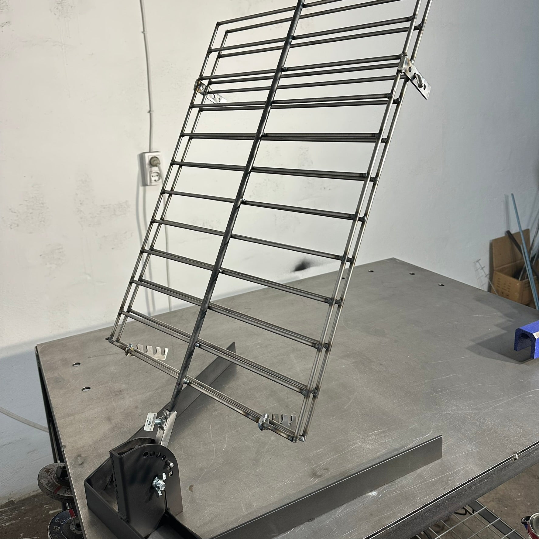 Cuenta con base de hierro regulable para apoyar en el piso, es desarmable y la base cuenta con varias posiciones para la altura (al asador podes usarlo de los dos lados)